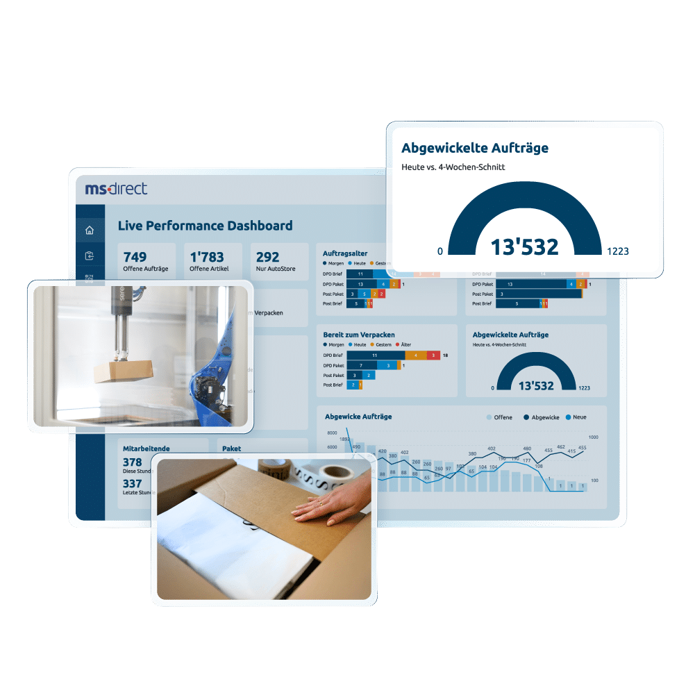Die Bestellabwicklung umfasst alle Schritte von der Übermittlung der Bestellung über Pick & Pack bis zum Versand. Bei MS Direct läuft dieser Prozess teilautomatisiert, robotikgestützt und vollständig datenbasiert ab. So stellst du sicher, dass jede Bestellung schnell, korrekt und markenkonform verarbeitet wird.